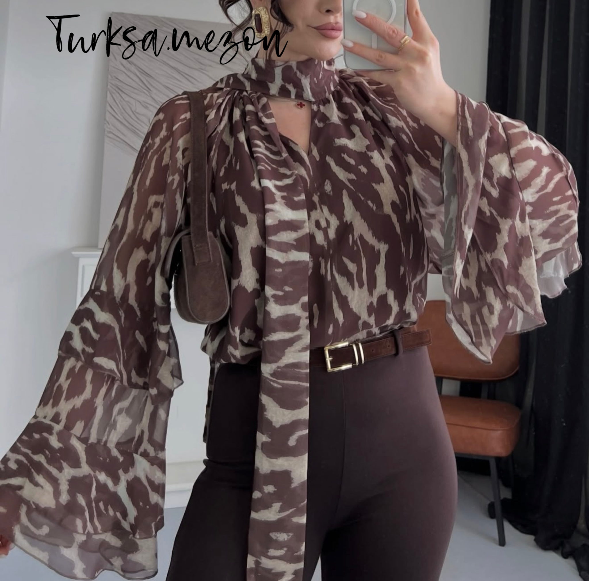 شومیز زنانه حریر آستین کلوش مجلسی طرح پلنگی ترک