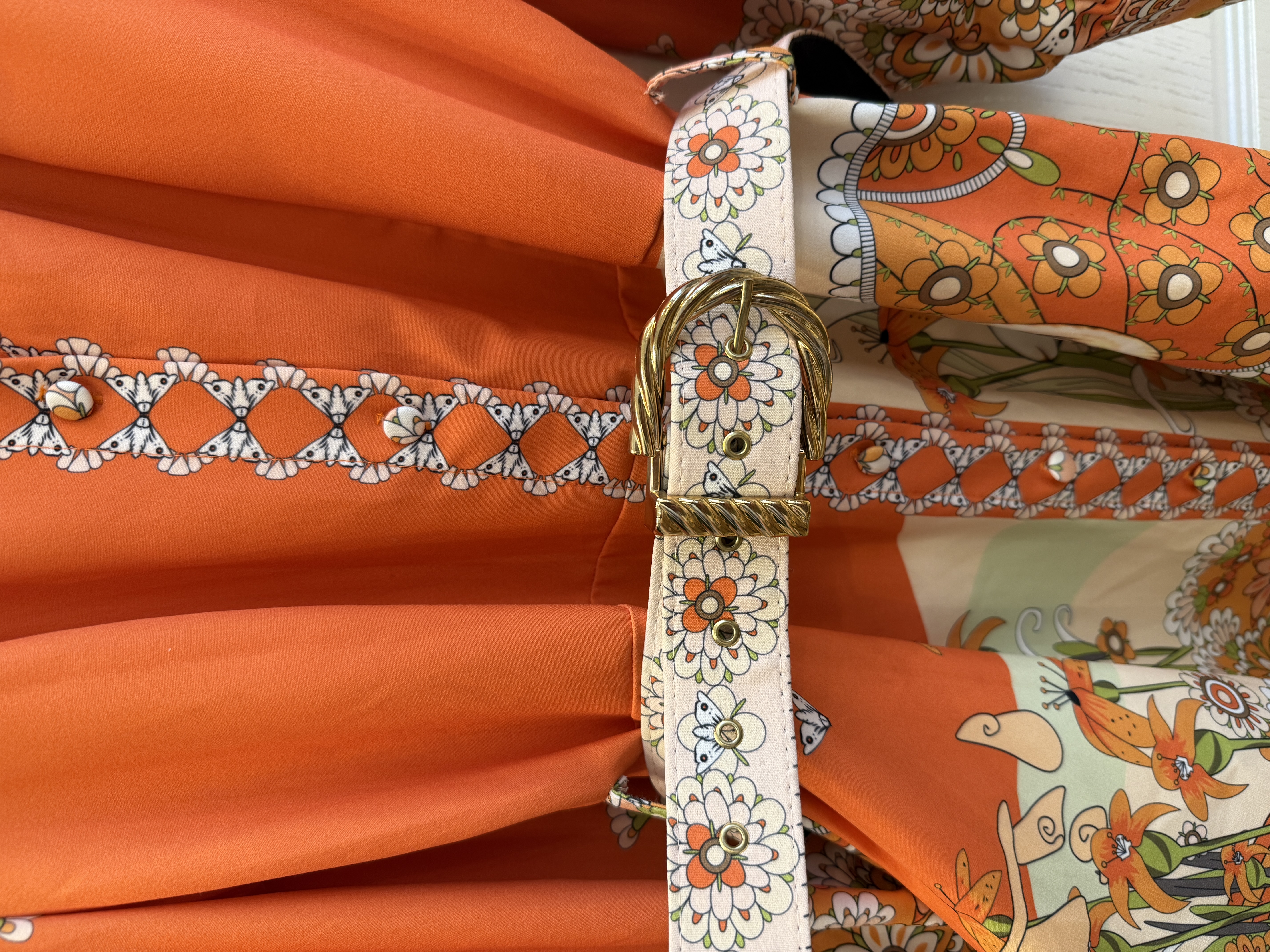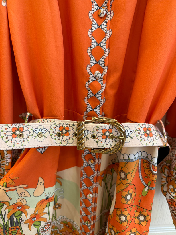پیراهن مجلسی کوتاه دخترانه نارنجی با کمربند و طرح طبیعت