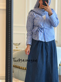 شومیز آبی راهراه ترک زنانه با گره کج و طراحی خاص
