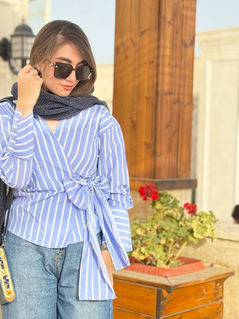 این شومیز آبی راهراه با طراحی گره کج و جزئیات ظریف، به راحتی با شلوار پارچهای، دامن یا حتی شلوار جین ست میشود و جلوهای خاص و مجلسی برای شما ایجاد میکند.