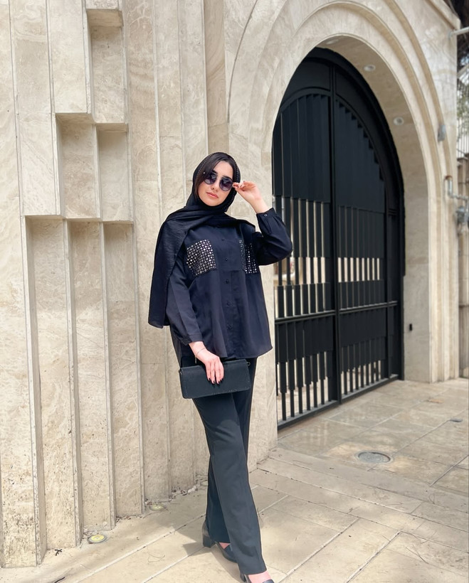 شومیز مانتویی مشکی با دو جیب روی لباس که نگین کار شده