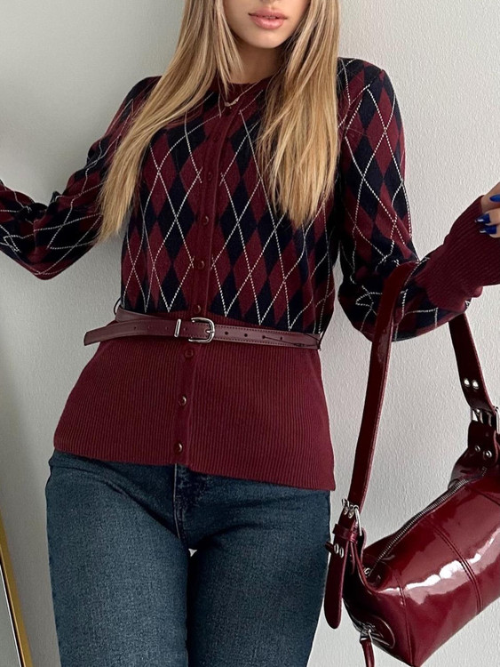 بلوز بافت زنانه طرح لوزی همراه کمربند/فری سایز برند ترک