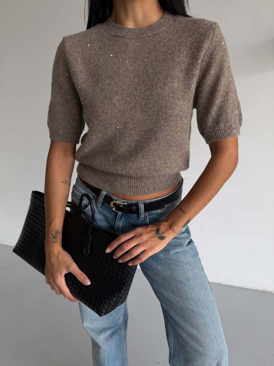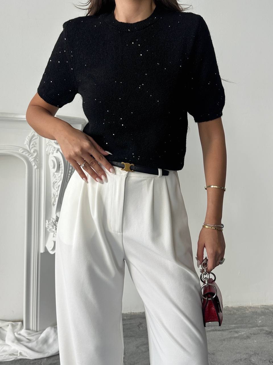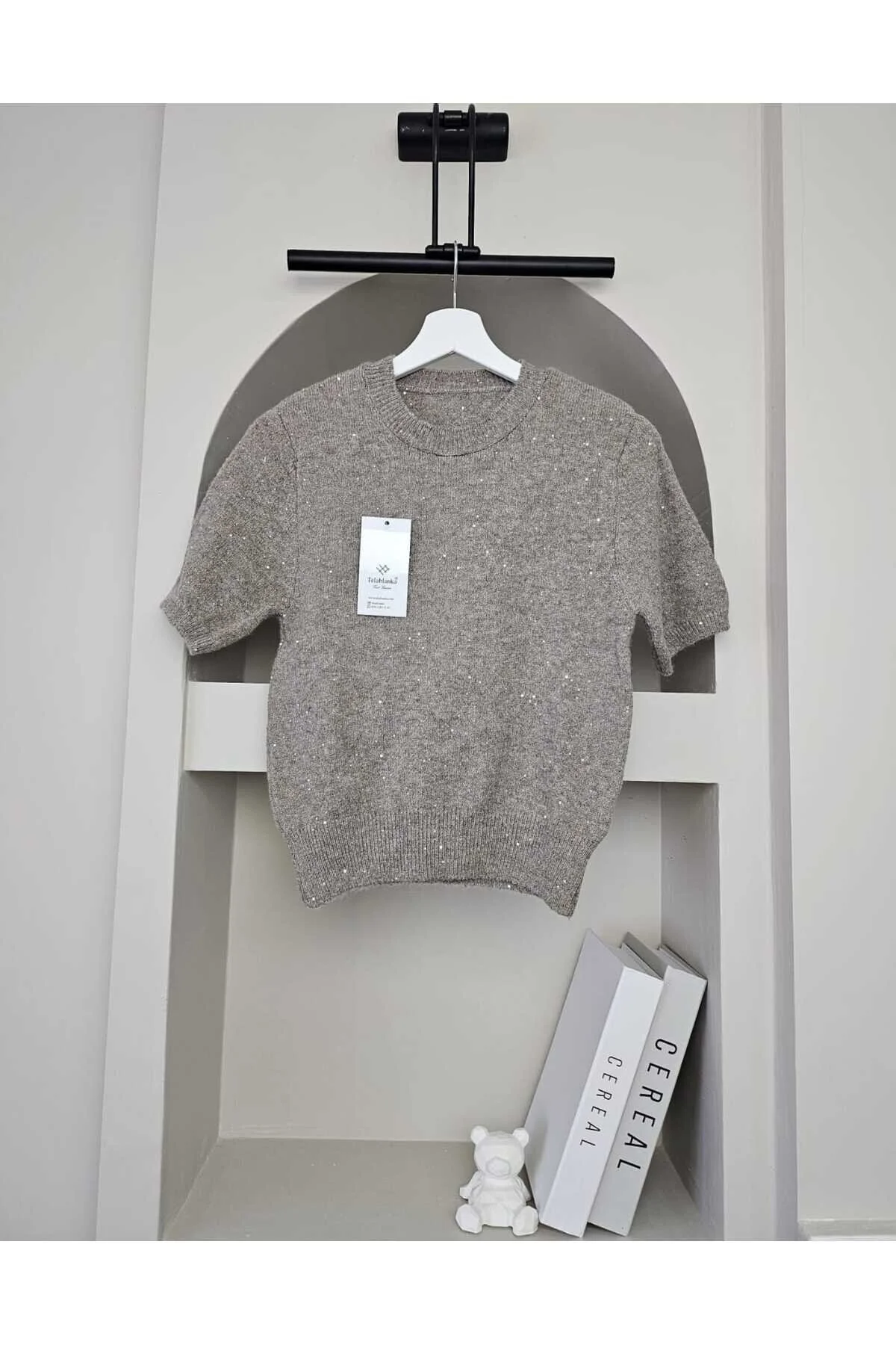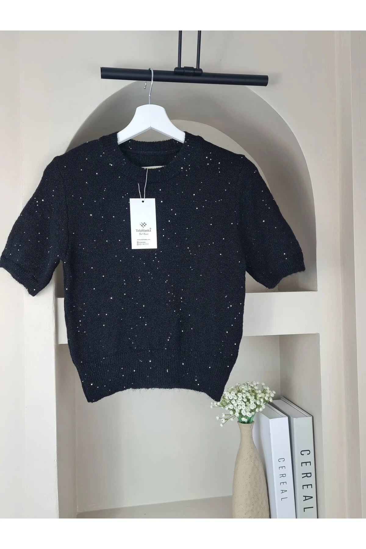 بلوز بافت استین کوتاه پولک دار بسیار شیک و مهمونی طور مناسب پاییز و زمستان در رنگبندی فری سایز مناسب ۳۶ تا ۴۶